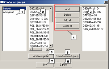 5. Button for adding a new group. 6. Button for removing a group.